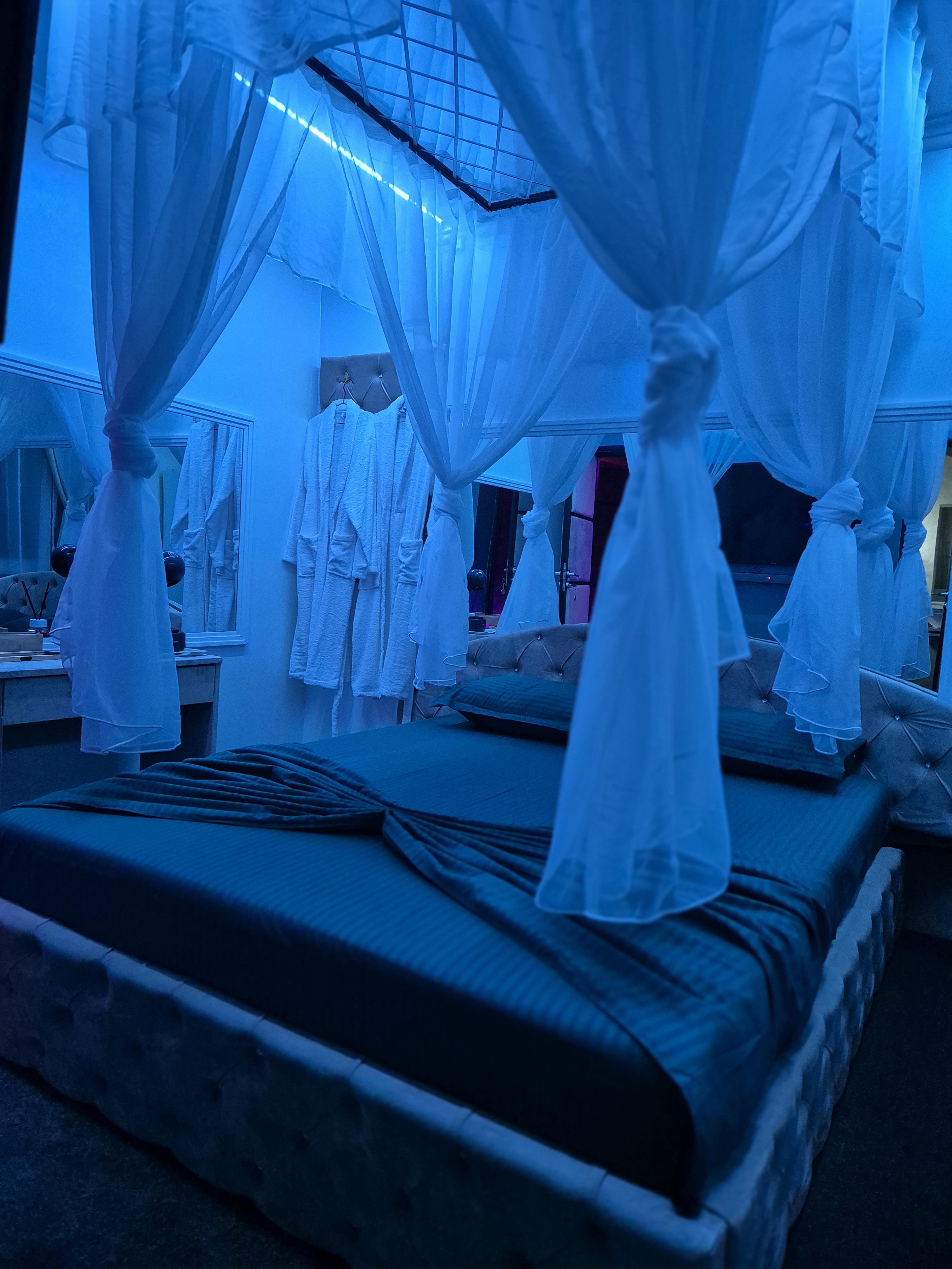 Aceasta camera are o suprafata de 25mp, pat cu baldachin, TV smart, masina de cafea, prosoape, articole de baie, sistem pentru muzica iar baia este prevazuta cu cada.
